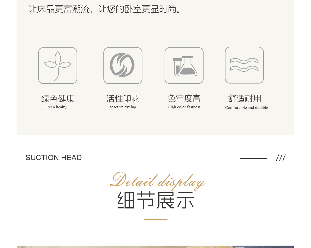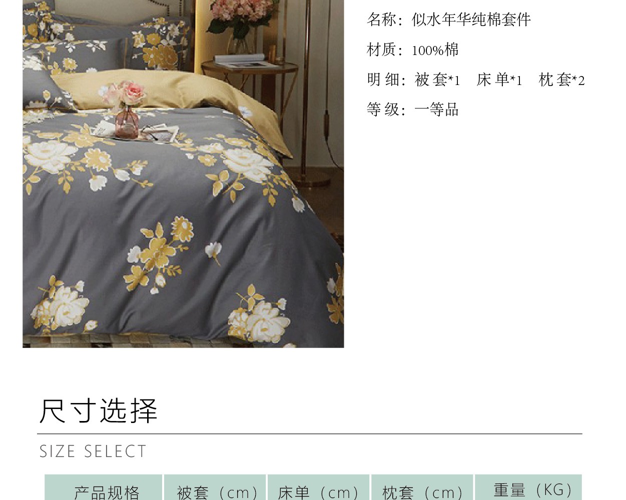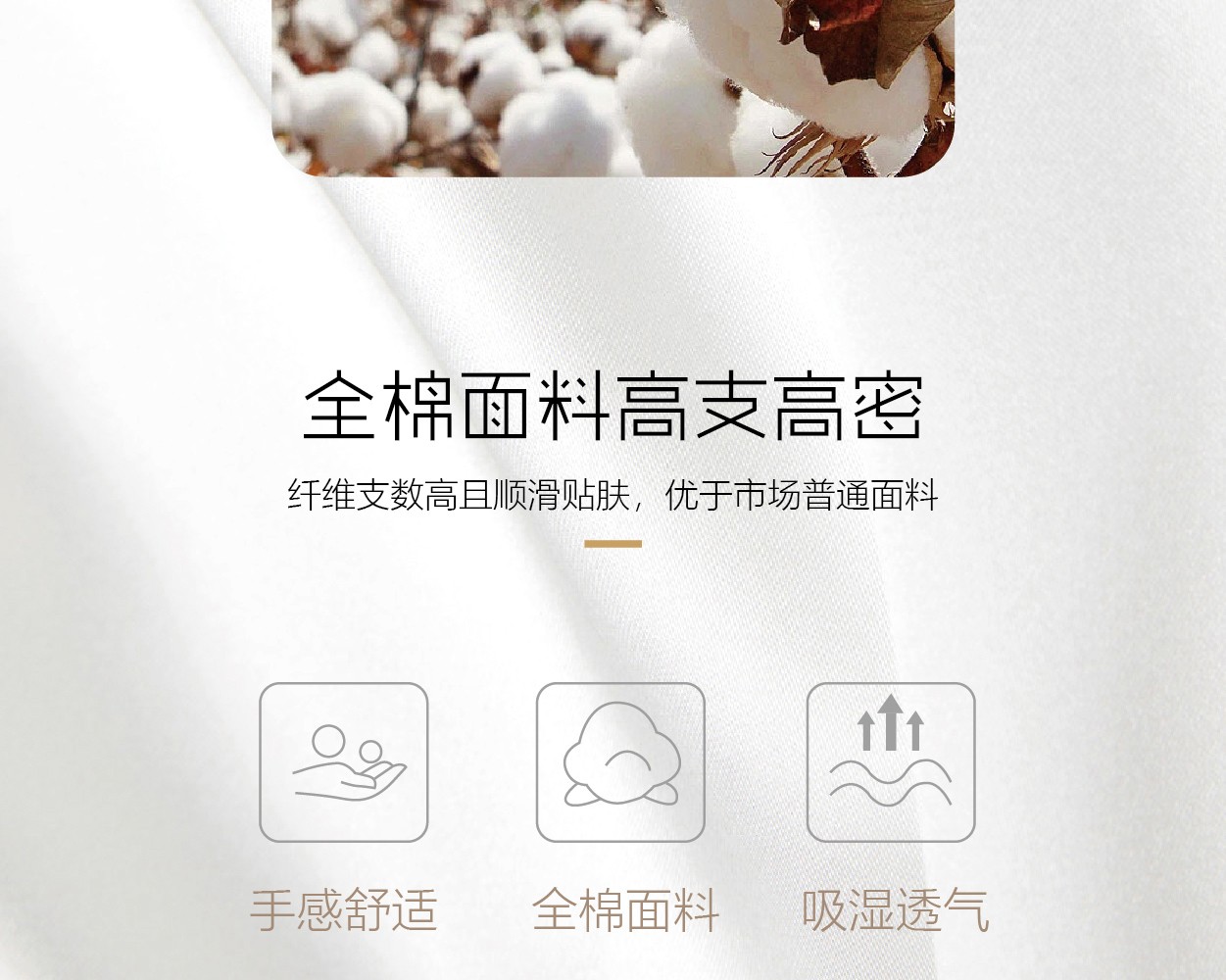 描述:100%纯棉面料,优质环保印染工艺,无任何甲醛、增白剂、安全环保健康 全棉面料,吸湿透气,滑爽亲肤,带给您舒适的睡眠体验