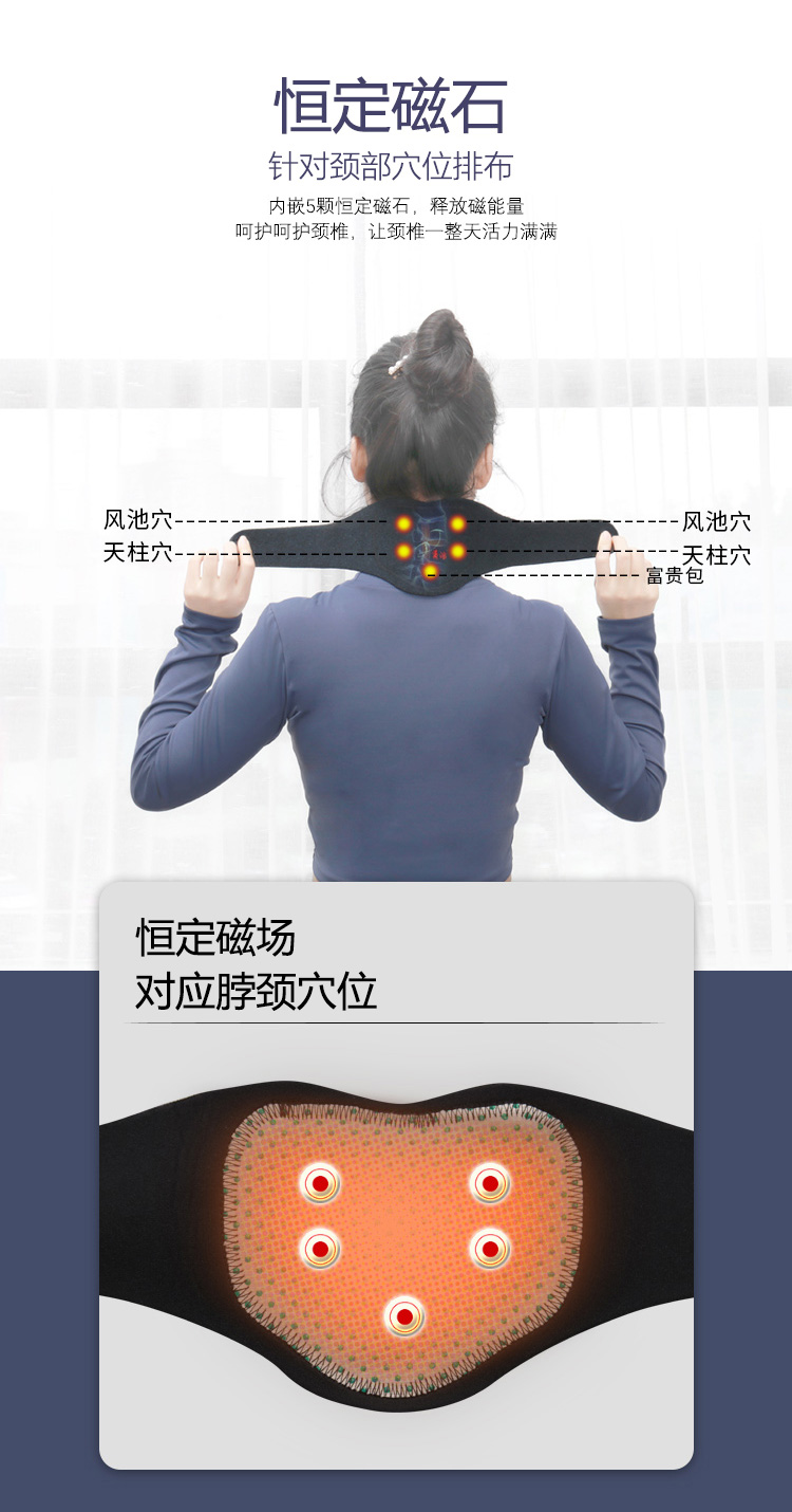 描述:内嵌5颗恒定磁石,以天然矿物质电气石为核心,可释放远红外、负离子能量,锁温速热,健康的热敷,给颈椎暖暖的呵护