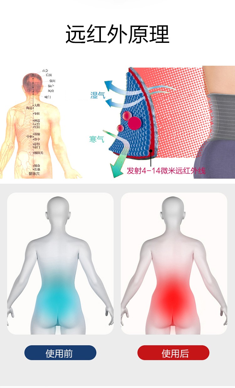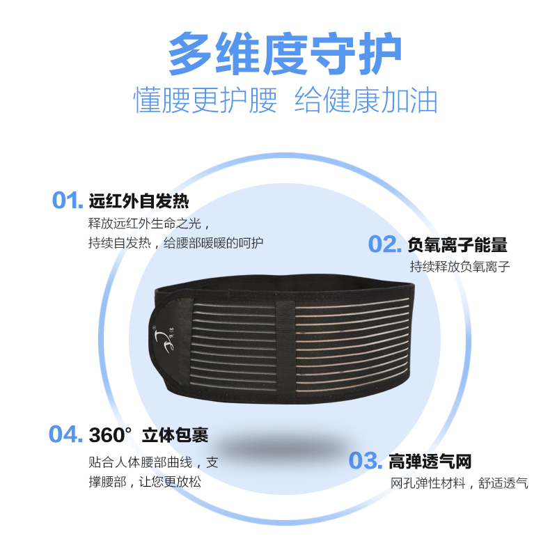描述:元气养生带是一款针对腰部问题研发,具有透气、远红外理疗、高强弹力、负离子能量等功能的腰带, 对腰部痛疼、腰部损伤的人士有很好的辅助理疗作用,长期使用可以缓解身体多种不适
