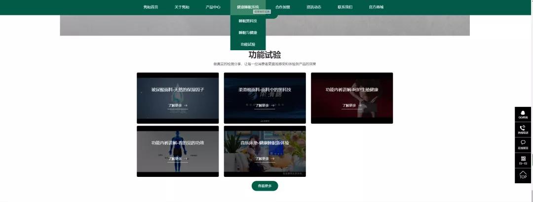新增了健康睡眠系统,让用户从产品功能如磁、远红外、负离子等,产品面料如抗菌防螨材料、进口功能面料、活性炭纤维等全方位多角度的了解产品成分,功能试验板块让用户更直观的了解产品功能及价值。