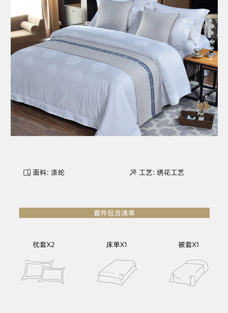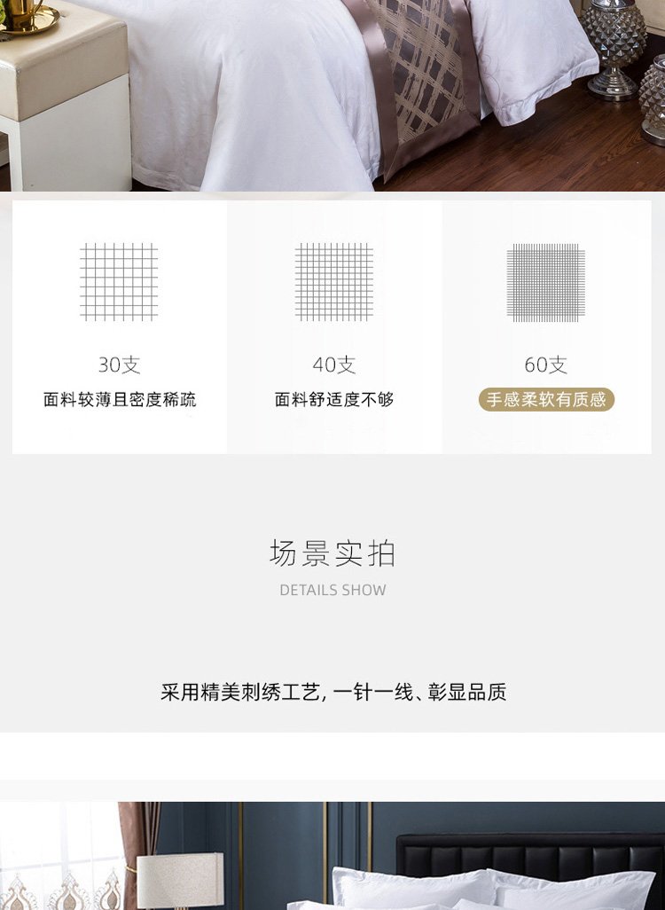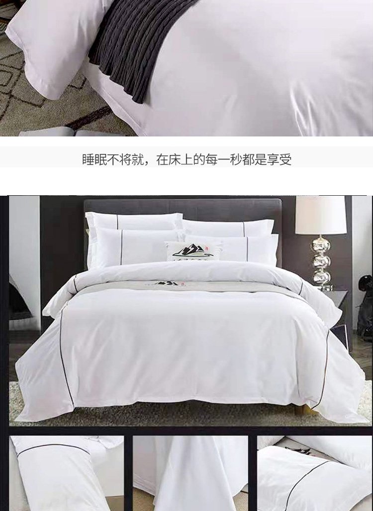 描述:本公司为客户提供各种酒店布草,多种款式、支持来图定制,均是全工艺一手品牌面料,细致考究的工艺,富裕每一个床品细腻如绸的柔软触感。